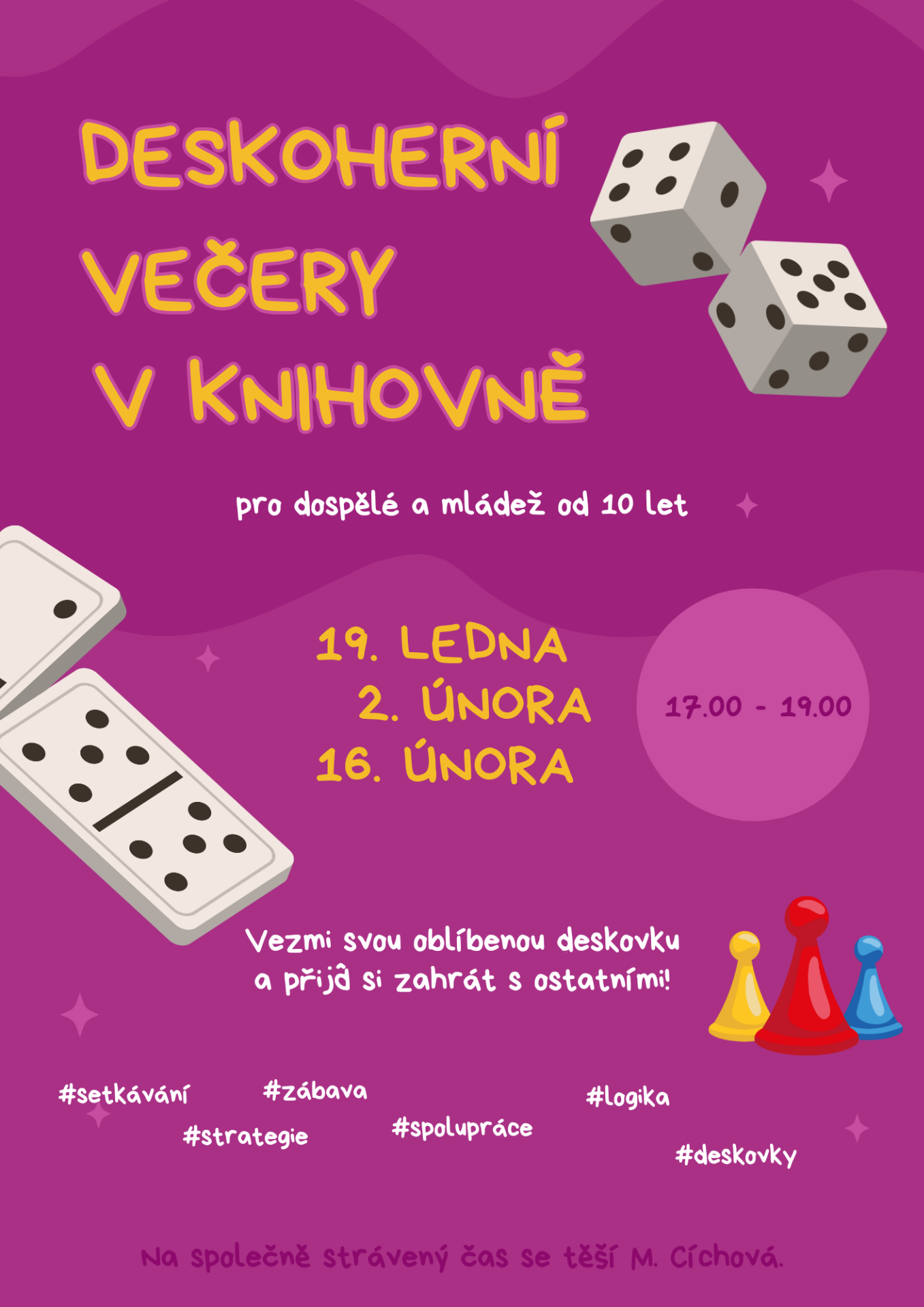 Počínaje 19. lednem a 16. únorem konče se vždy od 17 – 19 hodin budou hrát v knihovně deskovky. Akce je naplánována na každé druhé pondělí a uskuteční se celkem 3 krát. Všichni příznivci deskových her jsou srdečně zváni. Můžete si zajisté přinést svoji oblíbenou hru a podělit se s ostatními se svými poznatky.