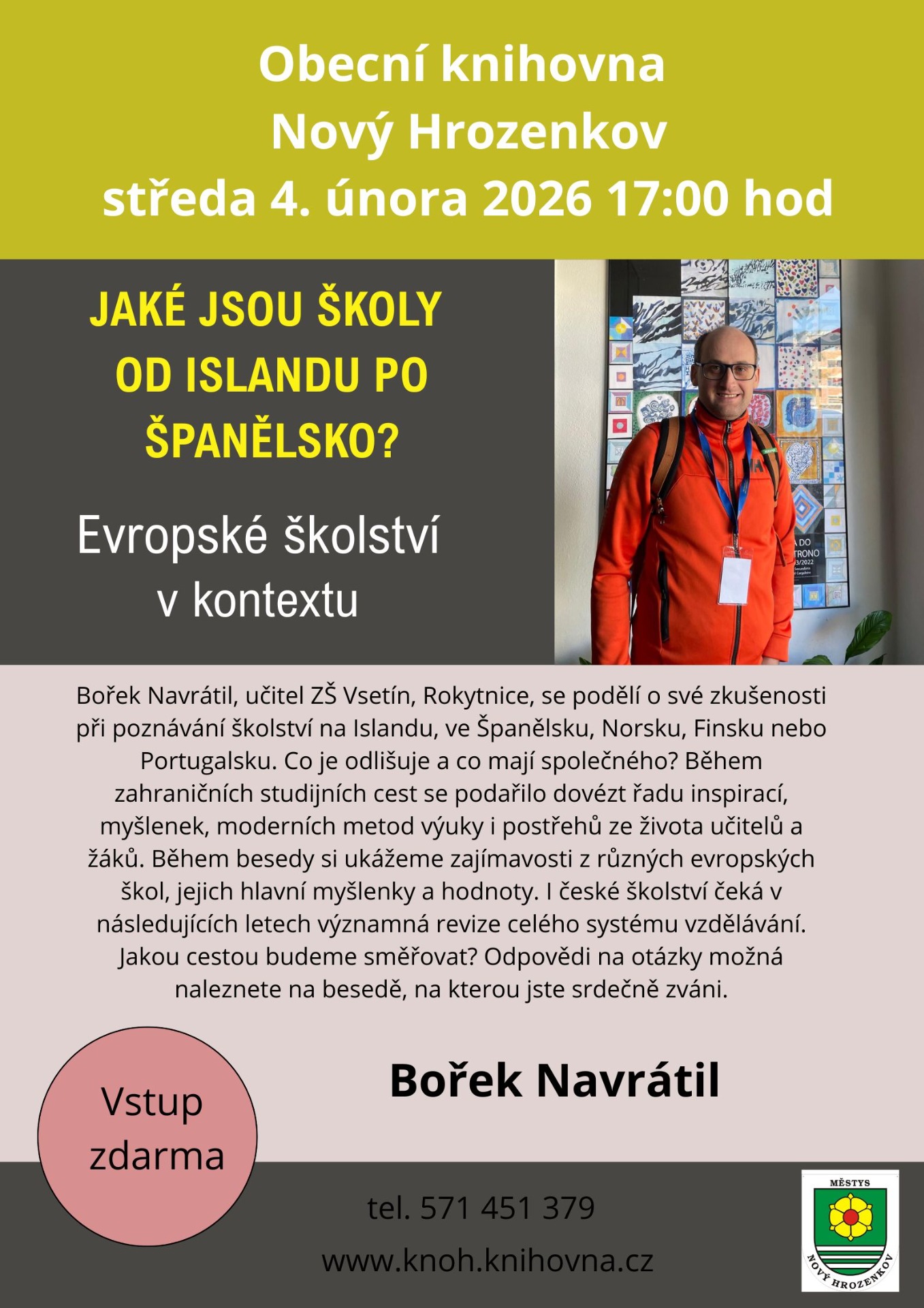 Bořek Navrátil, učitel ZŠ Vsetín Rokytnice, se podělí o své zkušenosti při poznávání školství na Islandu, ve Španělsku, Norsku, Finsku nebo Portugalsku. Co je odlišuje a co mají společného? Během zahraničních studijních cest se podařilo dovézt řadu inspirací, myšlenek, moderních metod výuky i postřehů ze života učitelů a žáků. Během besedy si ukážeme zajímavosti z různých evropských škol, jejich hlavní myšlenky a hodnoty. I české školství čeká v následujících letech významná revize celého systému vzdělávání. Jakou cestou budeme směřovat? Odpovědi na otázky možná naleznete na besedě, na kterou jste srdečně zváni.